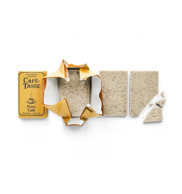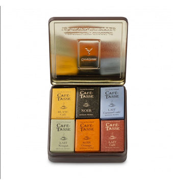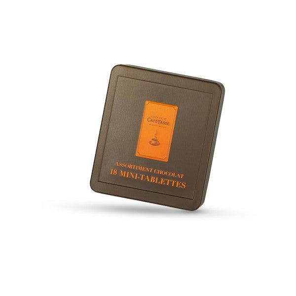 Perfect as a gift or a treat for yourself, this stylish matt brown tin with a beautifully embossed orange logo from Café-Tasse holds an irresistible selection of 18 mini 100% Belgian chocolate bars.
