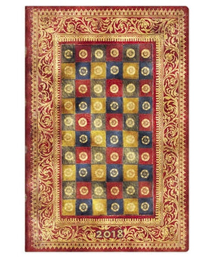 This 12-month diary features a bold red, green, yellow, and blue checkered design against a red and gold frame. It measures 9.5cmx14cm and has 368 pages, including additional note space and other supplementary features.