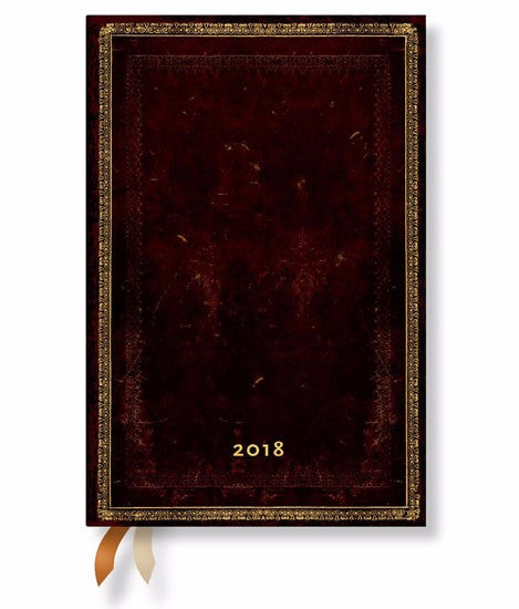 From Paperblanks, the Black Moroccan diary draws inspiration from renaissance style book binding, and has a wonderfully embellished cover. With a week at a time verso format, the diary also includes a removable address book, memento pouch and two ribbon page markers.