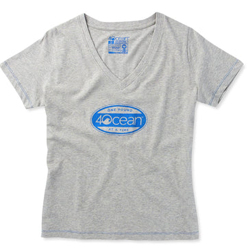 This Women's 4Ocean v-neck t-shirt features a distressed surf board with 4Ocean's 'One Pound at a Time' mantra detailed.