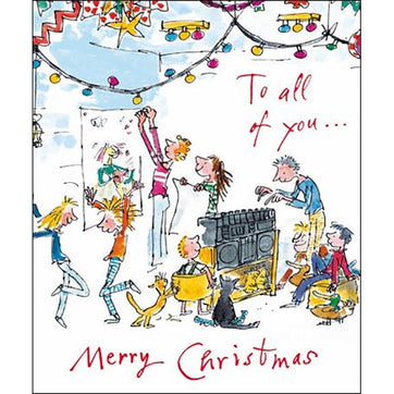 To all of you Merry Christmas. This glitter varnished Christmas card depicts a chaotic scene of last minute Christmas decorating perfect for those who always leave it to the last minute. The card is on family friendly board, has the message "Merry Christmas and a Happy New Year" inside and comes with a quality envelope.