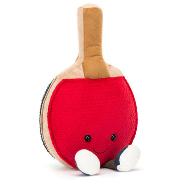 Grab a Jellycat Amuseables Sports Table Tennis bat and get hitting with this textured, soft, squishy ping-pong pal. Little navy trainers finish off this fashionable friend whose happy to see you and ready to swing across the table with a soft, suede handle.