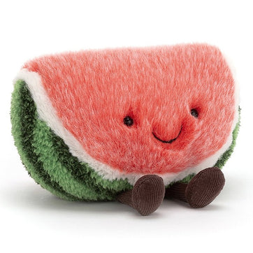 This mini Jellycat Amuseables Watermelon is a little slice of fun. With its pink and green soft fur, cheeky smile and suede boots, this watermelon pal is one in a melon.