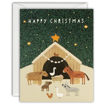 Happy Christmas. This cute Christmas nativity scene by Linda Tordoff is finished with shiny glitter and includes farm animals around the baby in the manger. This Christmas card has the message 'Happy Christmas' inside, and comes with a quality white envelope.