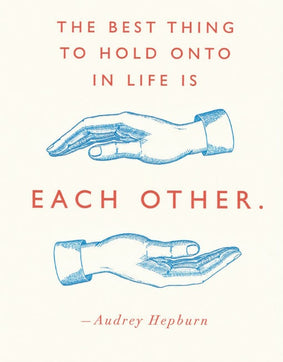 Celebrate love with this sweet letterpress card featuring a lovely vintage-style illustration of two hands alongside the Audrey Hepburn quote 'The best thing to hold on to in life is each other.'