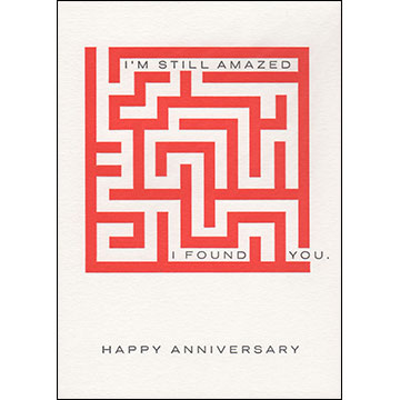 Let that special someone know what they mean to you with this quirky letterpress anniversary card which reads 'I'm still amazed I found you' alongside a red maze illustration.