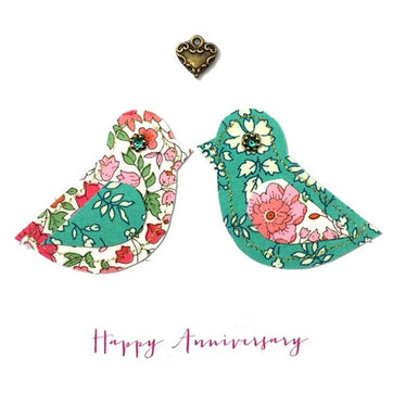 Happy Anniversary card featuring two flower pattern love birds and a small heart.