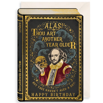 Celebrate a "legend" in their own right with this exquisite Shakespeare-inspired birthday card. Perfect for the bibliophile or the budding thespian, the card features a beautifully detailed illustration of the Bard himself. The front carries a charmingly archaic sentiment: "Alas! Thou art another year older, but thee haven’t aged a day!", followed by a classic "Happy Birthday". Meticulously crafted in the UK, this card boasts luxurious die-cut detailing, elegant embossing, and shimmering gold foil finishes that truly set it apart. Printed on 280gsm textured card stock, it offers a premium feel that warrants a spot on any mantelpiece.