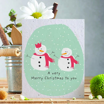 This lovely Christmas card reads 'A very Merry Christmas to you' alongside a sweet snowman illustration. It is printed onto carrot seed card - in the spring simply plant the card in soil and watch them grow!