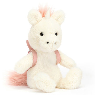 This Jellycat Backpack Unicorn is ready to go for a ramble. With its pink mane and tail, cream fur and suede horn, this unicorn is ready to take on the world with its little backpack ready for all its tiny supplies.