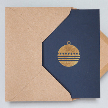 Rose gold Christmas bauble foil blocked navy card. This Christmas card is printed on 270gsm paper, is blank inside, packed in biodegradable cellophane and comes with a quality Kraft envelope.