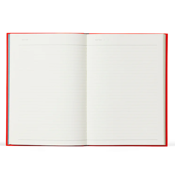 The softcover is finished in high-quality bright red fabric and secured with a matching elastic band to keep notes neatly in place. Inside, soft grey lined pages provide an easy writing surface.