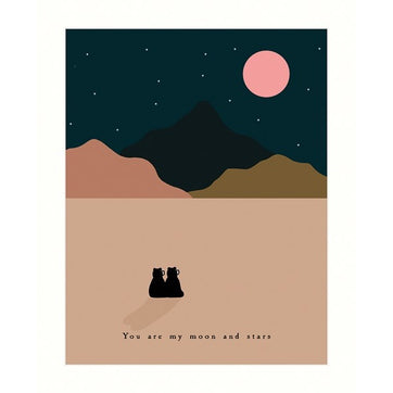 This cute card reads 'you are my moon and stars' alongside a sweet illustration of a bear couple looking at the night sky, with embossed details for extra depth. Blank inside.