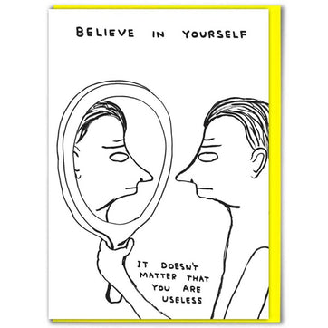 Believe in Yourself. It doesn't matter than you are useless. Make them laugh with this David Shrigley confidence boosting illustration. This self reflective card is printed on forest friendly card, is blank inside and comes with a quality yellow envelope.