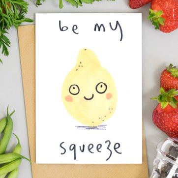This adorable card reads 'be my squeeze' with a cute illustration of a blushing lemon.