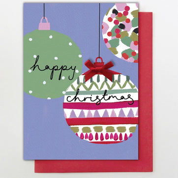 Happy Christmas. These over-sized Christmas tree baubles are hand finished with a red bow and sparkly gems. This christmas card is blank inside, printed on luxury card and comes with a red envelope.