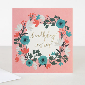 This beautiful card reads ‘birthday wishes’ and features a lovely floral illustration alongside gold type on a sweet pink background.