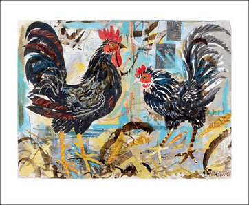 Standing proud, these cockerels are taken from a collage by Mark Hearld. This card has been left blank for your message.