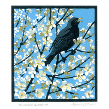 A stunning Blackbird on a Blackthorn branch linocut by the illustrator Robert Gillmor. This card is blank inside and comes wrapped with an envelope.