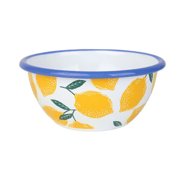 Bring a fresh, sunny touch to your table with this lemon enamel bowl. Featuring bright yellow lemons with green leaves and a soft blue rim, it’s perfect for salads, snacks or shared sides.