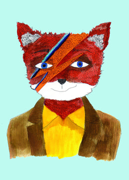 An illustrated greeting card featuring a fox dressed as David Bowie. This card has been left blank inside for a personal message and it comes with a brown envelope.
