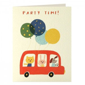 A pack of five high quality notecards illustrated by Ekaterina Trukhan and printed on textured cream board. The image shows a bright red bus with three animals inside holding colourful balloons. The message on the front of the cards is ‘Party Time!’.
