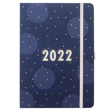 This lovely 2022 diary has a day-per-page format. The cover features a beautiful navy blue dot design with elastic closure.