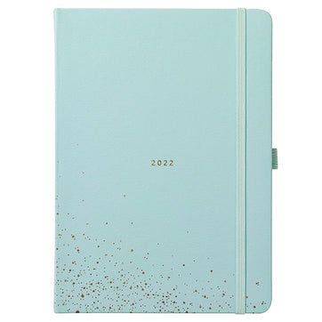 This beautiful 2022 diary features a day-per-page format, conveniently divided into work and home columns. The light blue cover is made from soft faux leather and has an elastic closure.