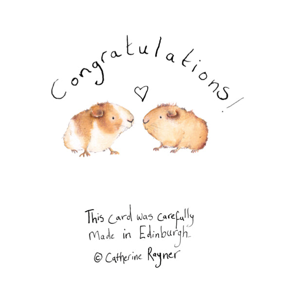 Exclusive to Paper Tiger, this sweet congratulations card has been illustrated by Edinburgh based artist Catherine Rayner. Featuring guinea pigs Carri and Gary, the card has been left blank inside for your own message and comes complete with an envelope ready to send. It has been made in Edinburgh on sturdy watercolour card.