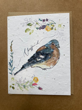 This sweet card features a cute chaffinch illustration with a botanical border. All cards from artist and creator Hannah Marchant are made with seeds, making them plantable! Simply plant under a thin layer of compost, water, and watch the seeds germinate. This card contains wildflower seeds.