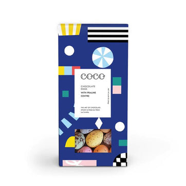 This bright and funky box contains a treasure of delicious, sugar-coated, milk chocolate eggs with a creamy, smooth praline centre.