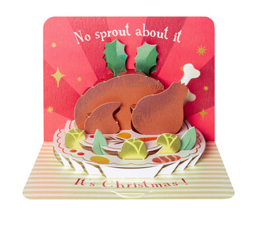 No sprout about it, it's Christmas! Say 'Happy Christmas' with this gorgeous and humorous 3D Christmas card from The Art File. Featuring a festive turkey that comes to life with a stunning die-cut and fold design, this card is sure to raise a smile.
