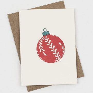 A collection of letterpress cards depicting Christmas baubles in different colours. These Christmas cards are blank inside, printed on 100% recycled card and comes with a brown ribbed recycled envelopes.