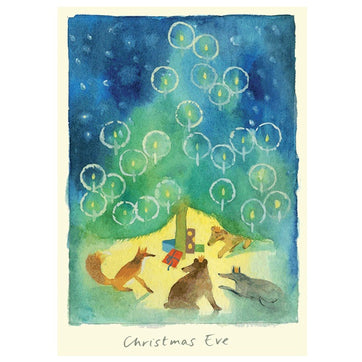 Christmas Eve. This Christmas card illustrated by Anna Shuttlewood shows a collection of woodland animals collecting around a tree to exchange gifts