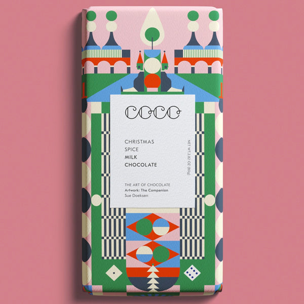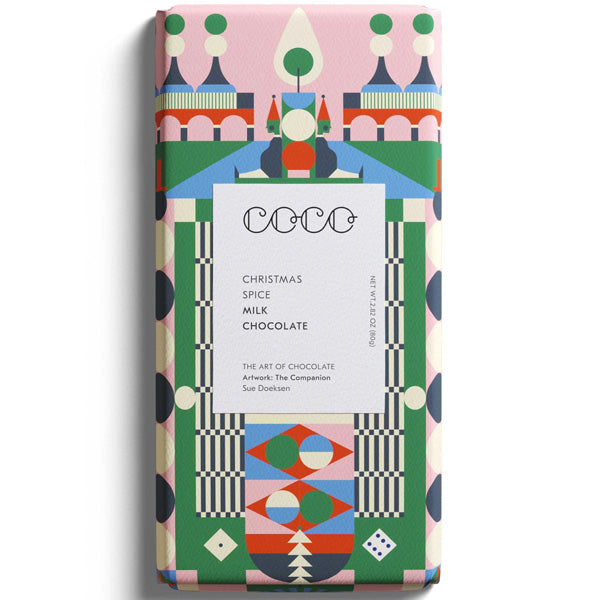 A super festive bar of superb milk chocolate with a warm blend of Spiced with Cinnamon, Cardamon, Nutmeg, Star Anise, Cloves & Allspice made by a local Edinburgh chocolatier COCO