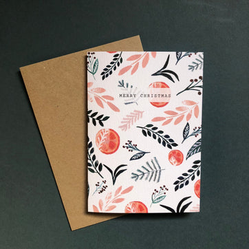 Chloe Hall Illustrations, based in Leicester, creates cards from loose line watercolours inspired by nature.For some added luxury this Christmas season, this beautiful fruit and floral illustration is also foiled. This card is printed onto textured 250gsm luxury card and accompanied with a 100% recycled kraft envelope and packaged in a biodegradable and compostable clear corn starch wallet.