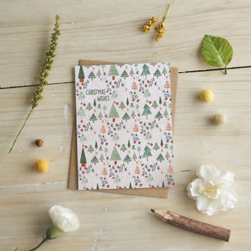 This unique Christmas card reads 'Christmas Wishes' alongside a festive tree pattern. It is printed onto wildflower seed card - in the spring simply plant the card in soil and watch them grow!