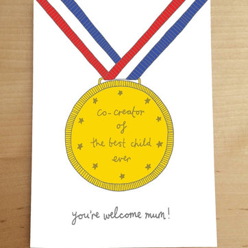 Co-creator of the best child ever, you're welcome mum. This Frankie Nicholas illustrated fold medal mother's day card is blank inside, is printed on 300gsm card and comes with a quality kraft envelope.