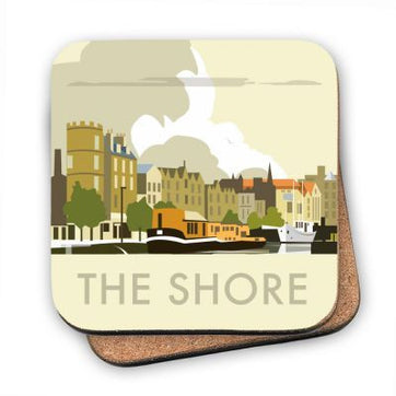 This 'The Shore, Leith, Scotland. By Illustrator Dave Thompson' square coaster is hard board and cork backed, with a beautiful glossy finish.