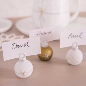 Add the perfect touch to your table this Christmas with these lovely white and gold card holders, shaped like festive baubles!