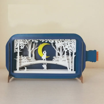 This lasercut card is made up of 6 layers that, when unfolded, make a romantic scene in a bottle. This card has been left blank for your own message.
