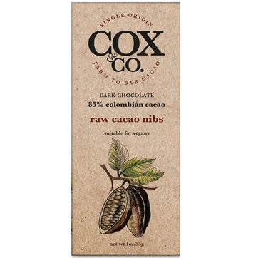This gorgeous little bar is made from 85% tumaco columbian cacao and a sprinkling of rich roasted cacao nibs for the perfect dark chocolate hit. Like all Cox and Co bars, it's ethically and sustainably produced.