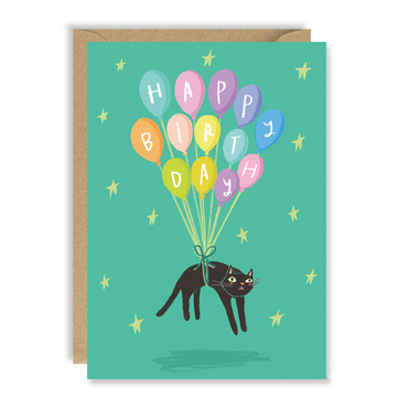 Beautifully illustrated by Scottish illustrator, Joy Nevada, this birthday card is super fun. Bright colours and an adorable illustration style of a crazy cat floating away on birthday balloons, this design stands out.