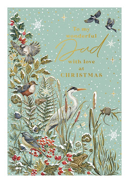 This beautifully illustrated card features a heron overlooking a frosted lake, surrounded by other wildlife and snowfall. With the words 'To my wonderful Dad, with love at Christmas' in embossed gold foil.
