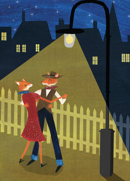 A beautifull illustrated greetings card featuring two foxes dancing in the street. This card has been left blank inside for a personal message and it comes with a brown envelope.