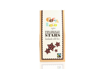 Treat yourself or a special someone to these velvety smooth 73% organic dark chocolate stars. Sprinkled with pieces of raspberry, these chocolate stars are organic, Fairtrade certified, palm oil free, and are vegan friendly.