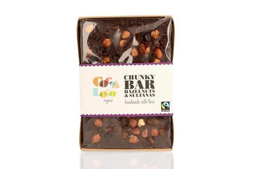 This chunky organic chocolate bar is handmade from rich 73% dark chocolate, and contains whole crunchy hazelnuts and fruity sultanas.