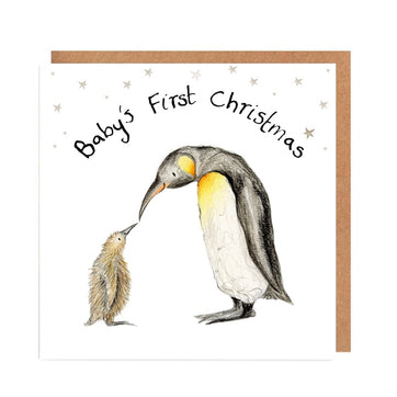 The perfect card to send for Baby's First Christmas, featuring two lovingly illustrated penguins, by Catherine Rayner. This card has been printed on heavy watercolour card, has been left blank for your own message, and comes with an envelope ready for sending.