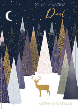 Send your amazing Dad happy Christmas wishes with this lovely gold foiled card featuring a strong stag amongst the winter trees. This family Christmas card has been left blank inside for your own message and comes with an envelope ready for sending.