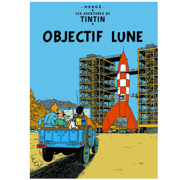 This brilliant Tintin poster features the original French 1953 cover of Destination Moon , objectif lune, designed by Herge. Tintin, Snowy, Captain Haddock, and Professor Calculus drive towards their rocket ship - adventure awaits! After spies, amnesia and self-destructing rockets, it will be a relief to finally blast off into space. The authentic poster comes rolled and unframed